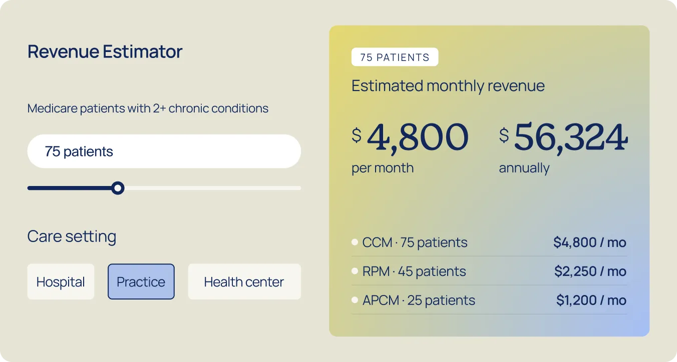 APCM reimburses across three risk-stratified tiers — $16/mo (Level 1), $54/mo (Level 2), and $117/mo (Level 3) — with no time-tracking requirements. For a panel of 200 patients at Level 2, that's ~$129K/year in recurring revenue, billable alongside RPM.
