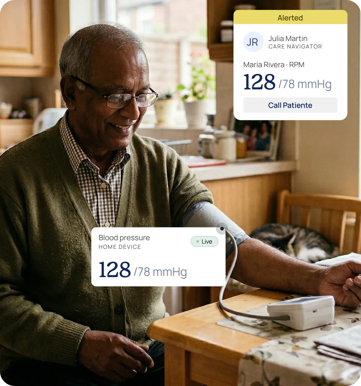 Cellular-connected devices ship directly to patients — blood pressure cuffs, glucose monitors, pulse oximeters, scales. No WiFi. No smartphone. No patient app. Daily readings are monitored by dedicated care navigators with AI-assisted alerts that catch deterioration before it becomes an ER visit.