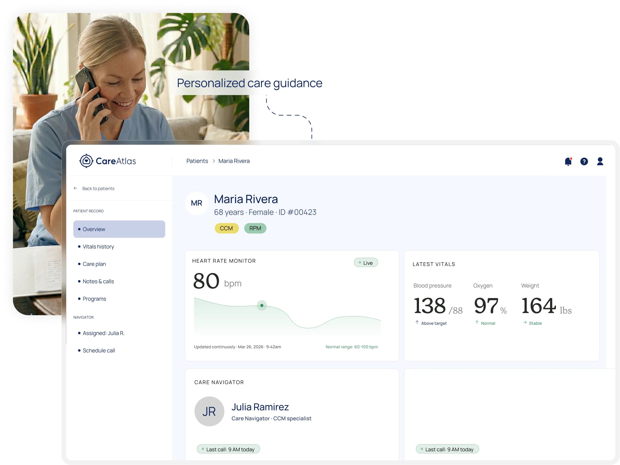 CareAtlas embeds dedicated care navigators and clinicians — real people, supported by AI — into your organization to manage RPM, CCM, TCM, and APCM programs. No upfront investment required for hospitals. Practices see revenue from month one. Patients stay healthier at home.